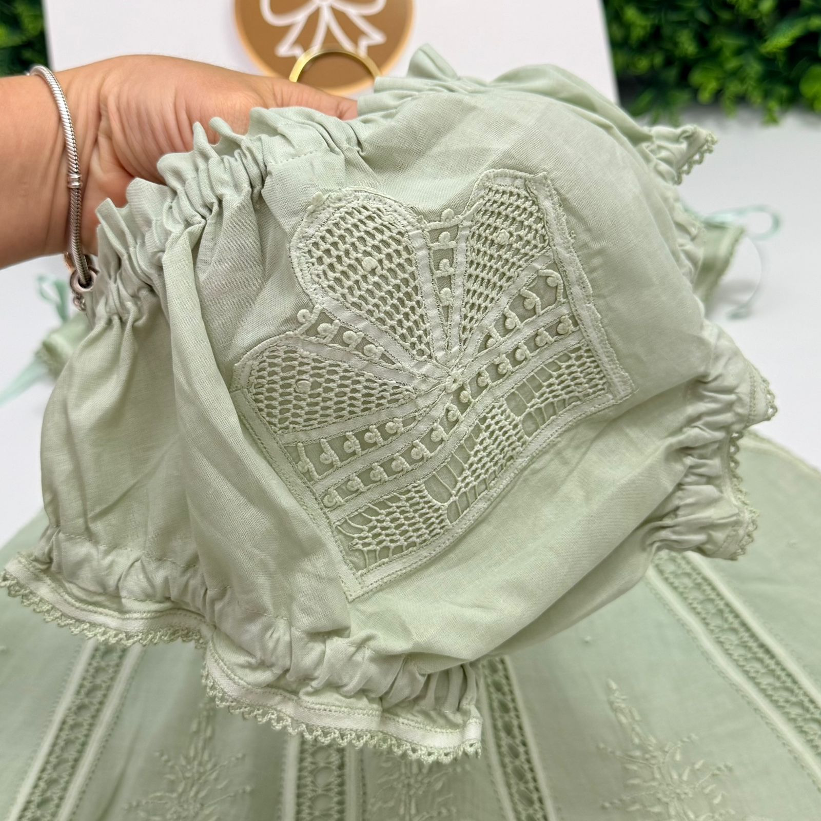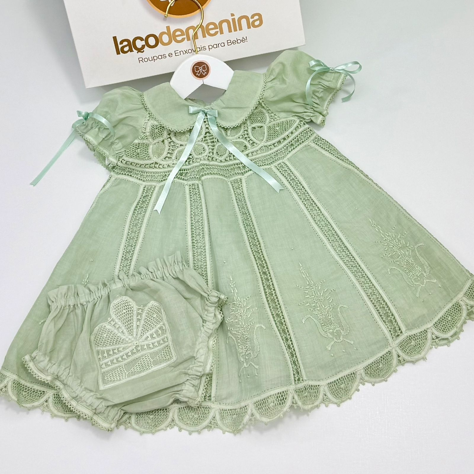 A parte superior traz mangas bufantes com fitas de cetim, gola arredondada e um laço central que complementa o visual romântico. A barrinha apresenta recortes rendados que realçam ainda mais a delicadeza do vestido. Acompanha uma charmosa calcinha combinando, também decorada com bordado.