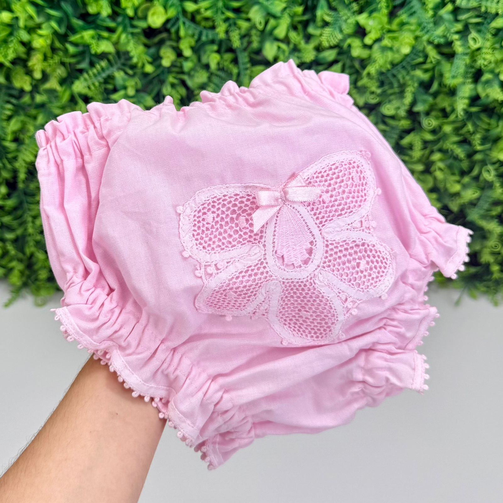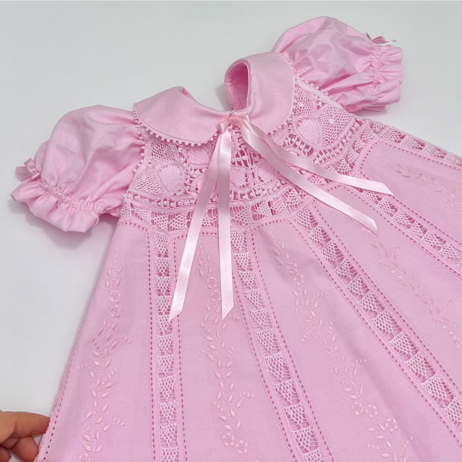 Vestido sem mangas confeccionado em cambraia de algodão de toque leve e suave, proporcionando conforto e delicadeza. O modelo apresenta ricos detalhes em renda renascença aplicada manualmente na barra, além de elegantes nesgas em renda princesa que valorizam o caimento e conferem charme ao design. Acompanha roupa interna confeccionada em cambraia de algodão, com gola delicada e mangas, garantindo maior conforto e acabamento refinado. O conjunto é finalizado com acessórios harmonizados, incluindo tiara e calcinha combinando, compondo um visual completo, clássico e atemporal.