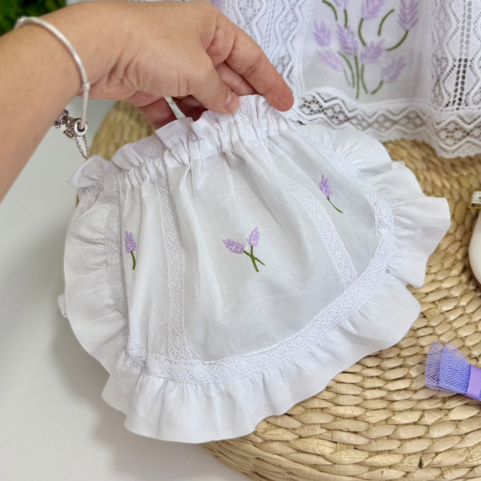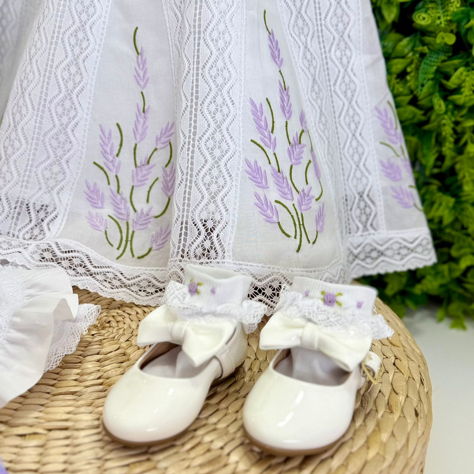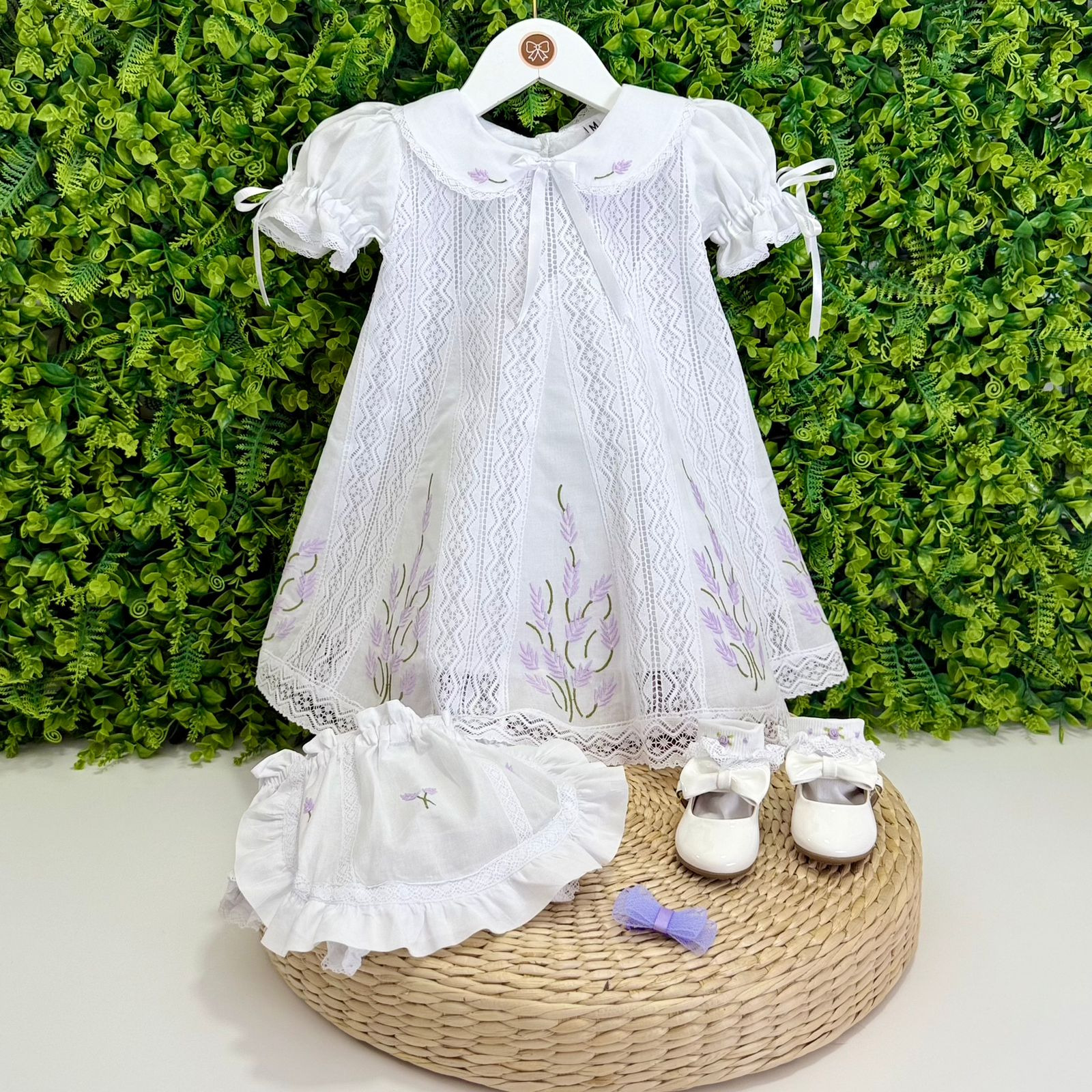 Vestido em cambraia branca, com bordado manual de lavandas que percorre seu comprimento e enfeita a golinha com charme sutil. O bico de renda Paraibana na barra e na bainha completa o visual com um toque de tradição.