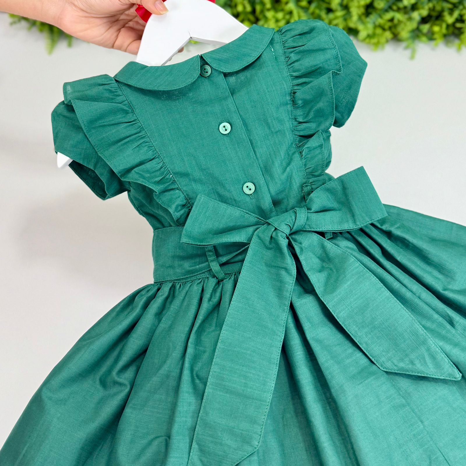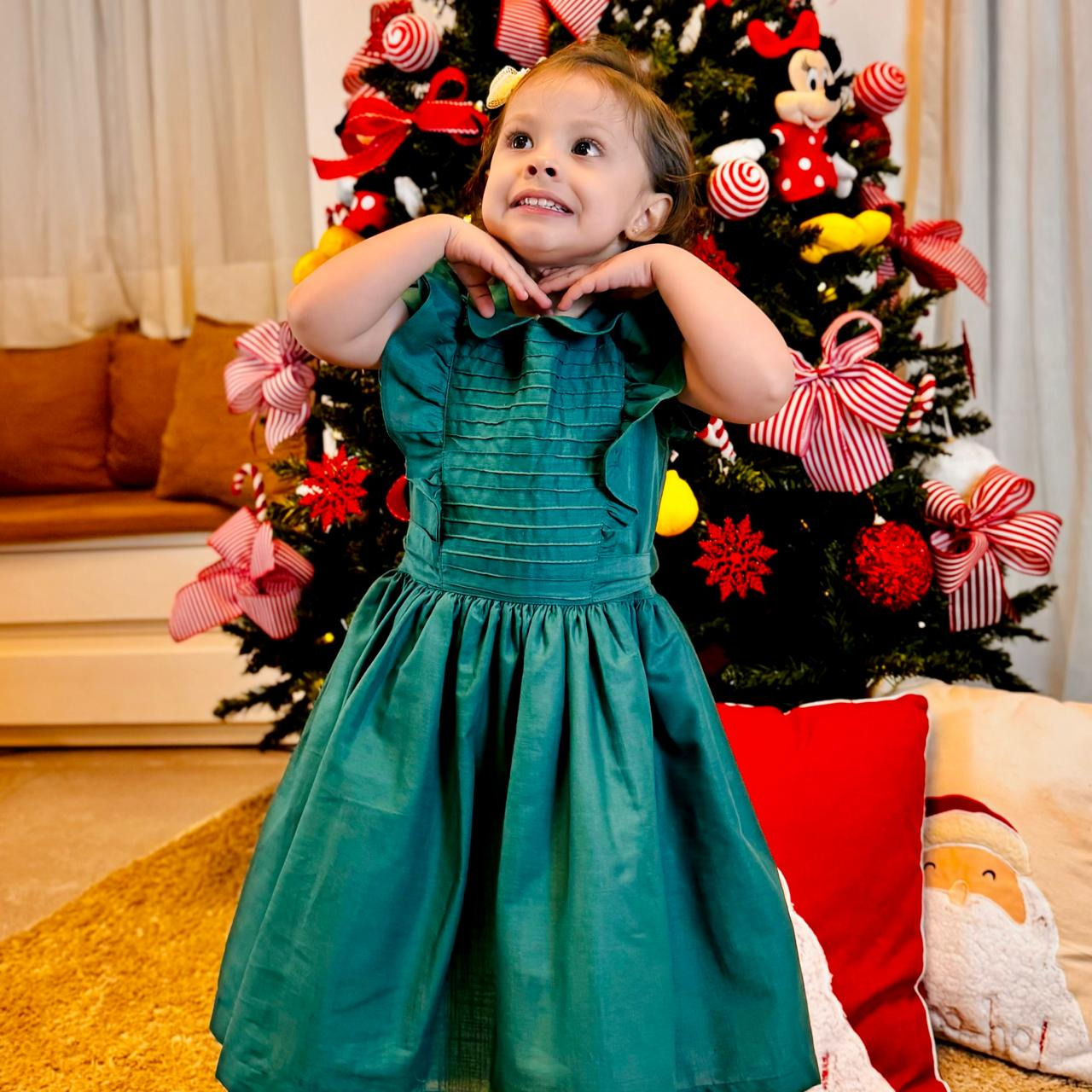 Clássico e encantador, este vestido infantil em 100% algodão na elegante cor verde bandeira é a escolha perfeita para celebrar com estilo. Com delicado laço nas costas, forro interno confortável e saia com armação embutida, proporciona volume suave e um caimento impecável. Um look pensado para brilhar nos momentos mais especiais do Natal.