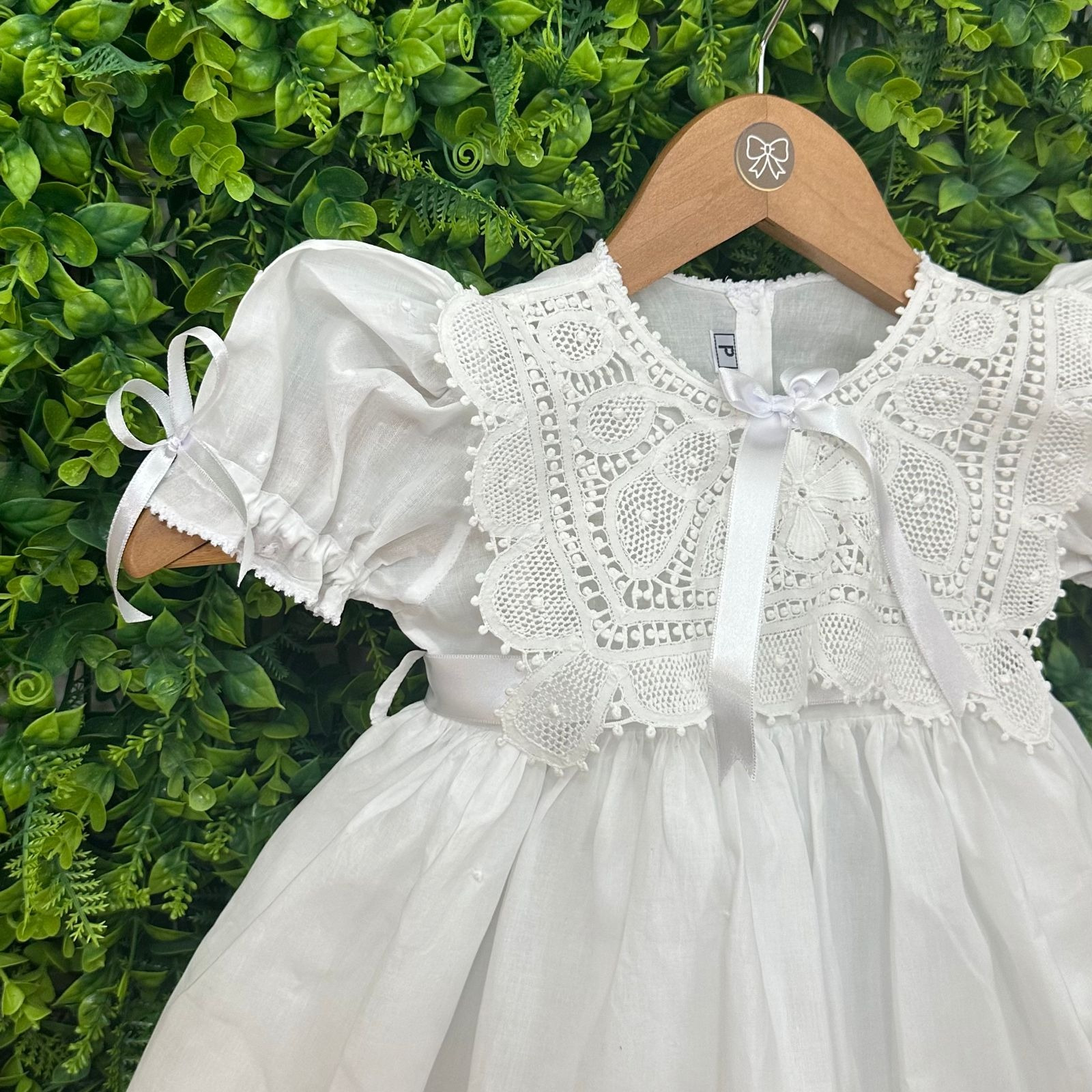 Vestido com mangas confeccionado em cambraia de algodão, com delicada pala de renda renascença no busto e gola quadrada no mesmo trabalho rendado. A barra apresenta aplicação em três camadas de costura, finalizada com bico de linha na cor branca. Possui forro interno em cambraia de algodão e delicado bordado na barrinha, garantindo acabamento impecável e toque artesanal.