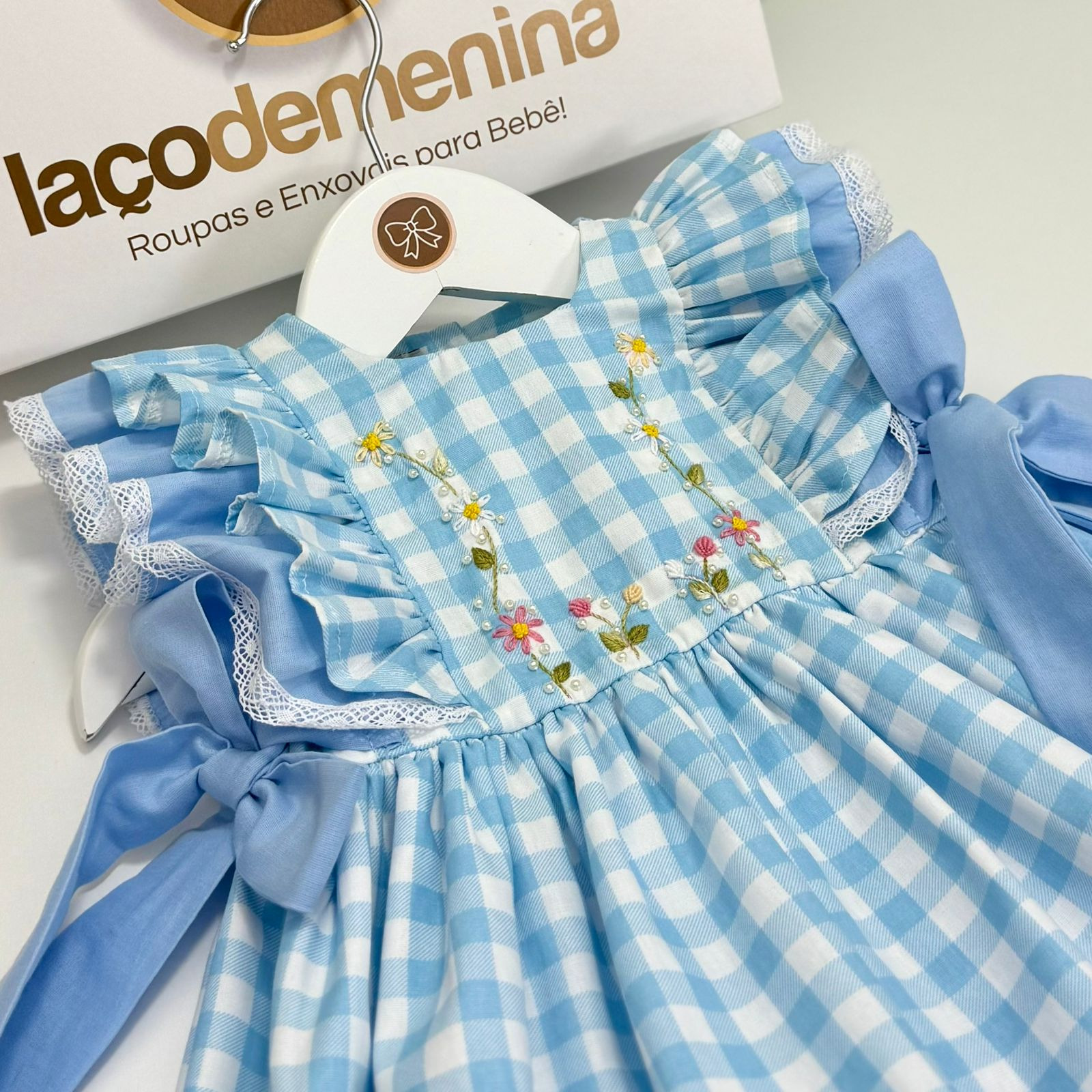 Vestido infantil confeccionado em tecido 100% algodão com estampa xadrez na cor azul. Possui delicado bordado manual floral no busto, laços laterais para melhor ajuste ao corpo da criança e botões nas costas que facilitam na hora da troca.
