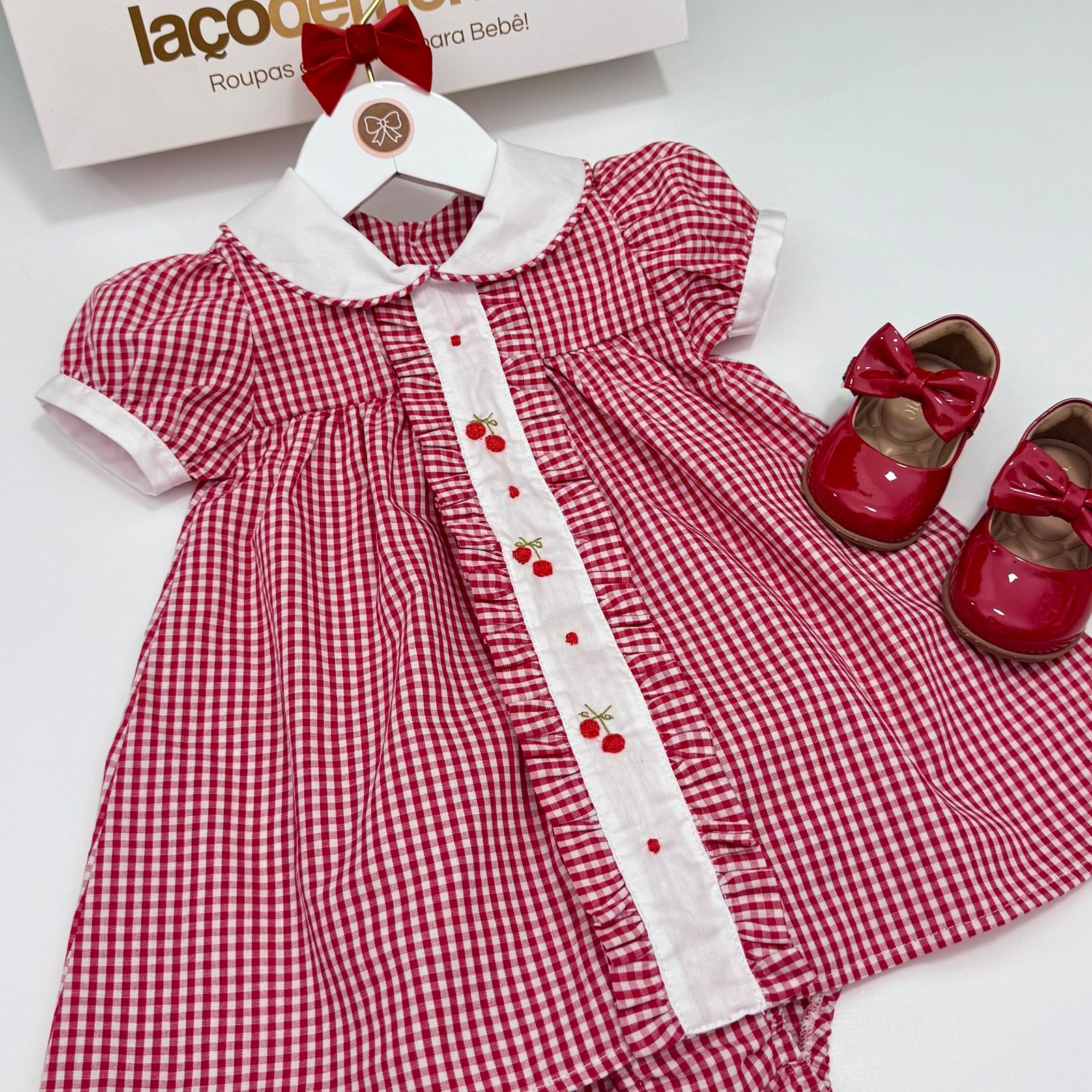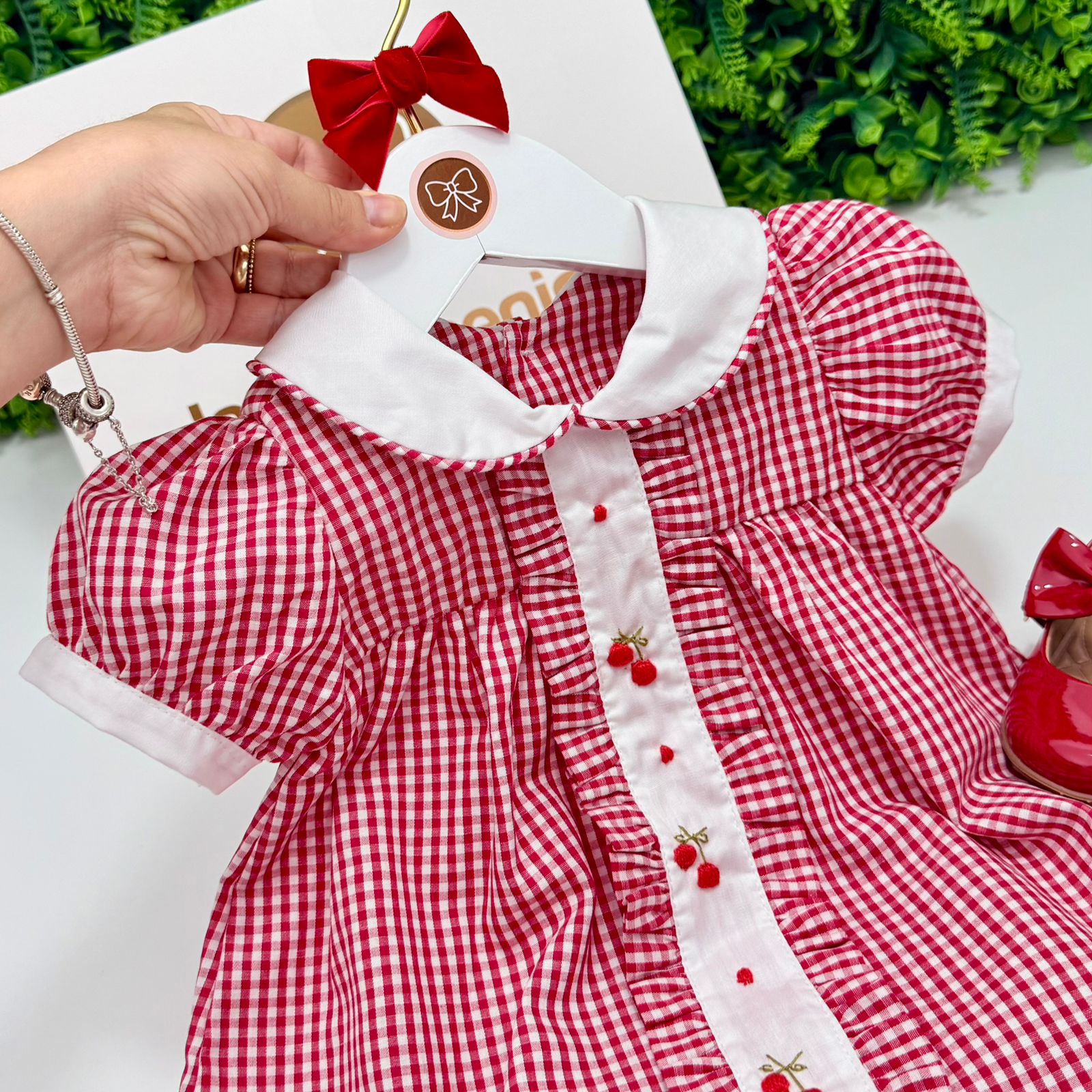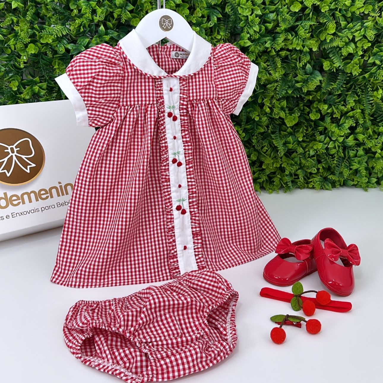Conjunto de vestido manga curta feita em tricoline 100% algodão. Possui tecido com estampa xadrez na cor vermelha e branca, com estampa cruzada fechada e bordados em cerejinha no centro com gola branca lisa.