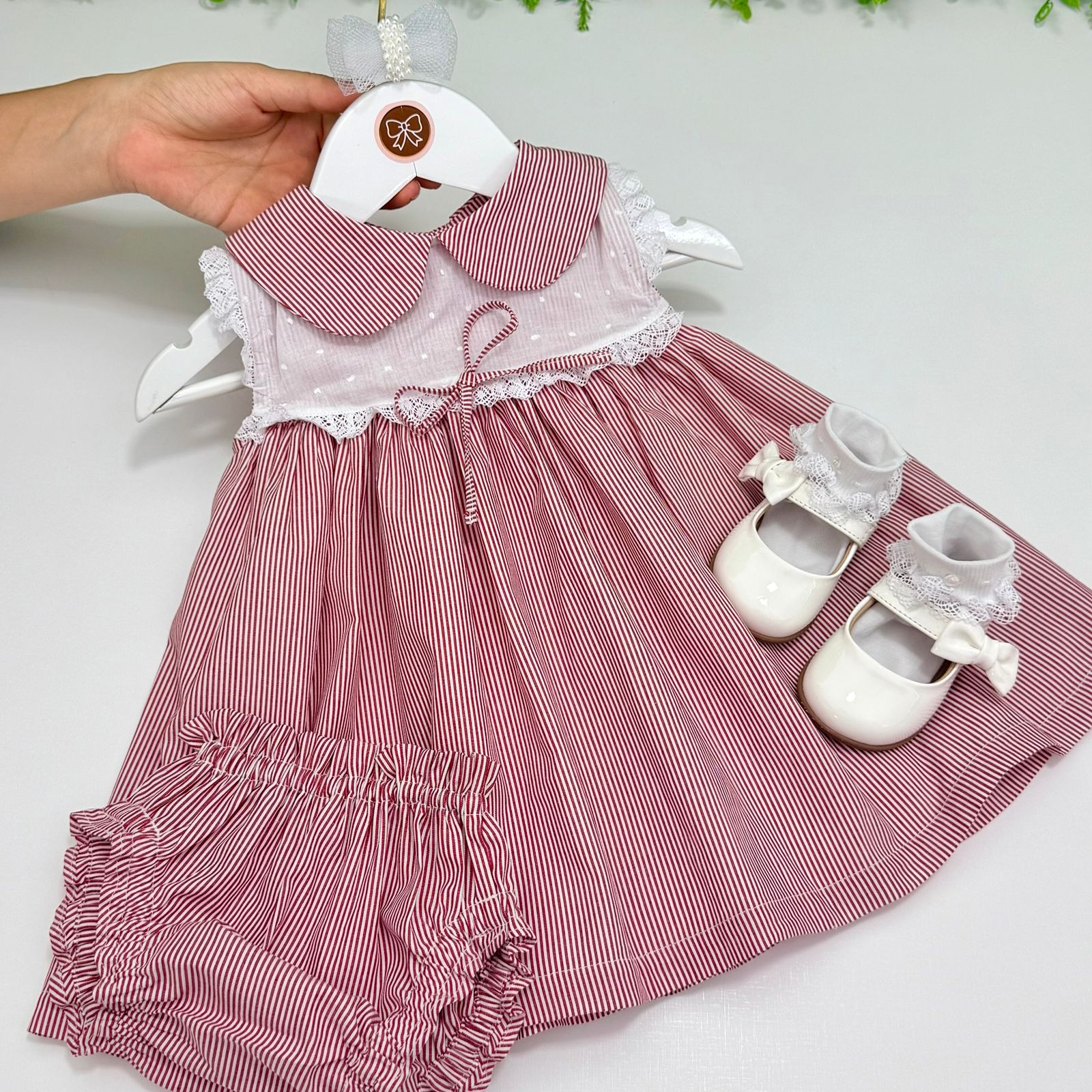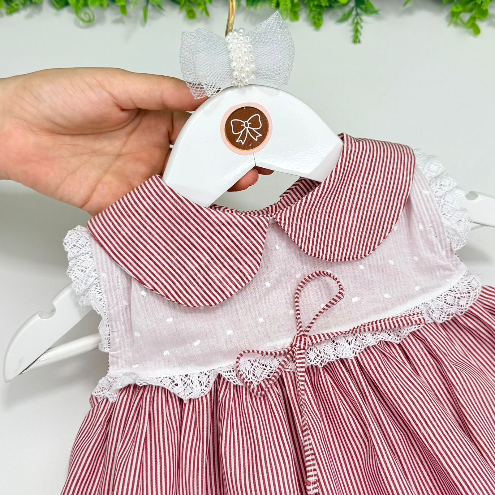 A saia listrada confere um visual clássico, enquanto os detalhes em renda e o laço frontal valorizam o acabamento. Conta com forro interno, proporcionando melhor caimento e conforto para a criança. O fechamento é feito por botões na parte de trás, facilitando na hora de vestir.